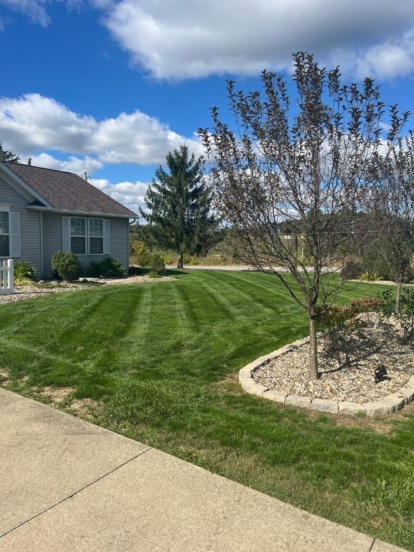 We offer weekly & biweekly lawn mowing, fertilization & weed control, mulch installation, gravel installation, bed cleanups, hedge trimming, spring refreshes, fall cleanups, dethatching, and aeration & overseeding.